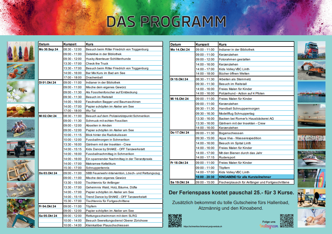 In diesen Tagen werden unsere Ferienspass-Flyer mit den neuen Kursen für diese Herbstferien in der Schule verteilt. Die Kinder können bereits auf dem Flyer und der Webseite die vielseitigen Angebote entdecken und sich überlegen, was sie am meisten interessiert. Ab dem 15. August beginnt dann die Wunschphase, wo jedes Kind die Lieblingskurse zur ganz persönlichen Wunschliste hinzufügen kann.